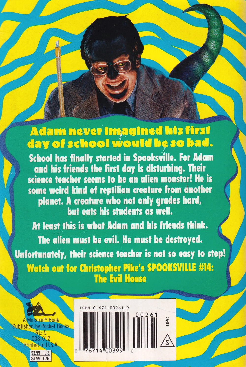 Adam never imagined his first day of school would be so bad. School has finally started in Spooksville. For Adam and his friends the first day is disturbing. Their science teacher seems to be an alien monster! He is some weird kind of reptilian creature from another planet. A creature who not only grades hard, but eats his students as well. At least this is what Adam and his friends think. The alien must be evil. He must be destroyed.