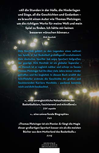 Dirk Nowitzki gehört zu den Legenden eines weltweiten Spiels, er hat Basketball grundlegend revolutioniert. Kein deutscher Sportler hat seine Sportart tiefgreifender geprägt. Dirk Nowitzki ist ein globaler Superstar – als Mensch ist er zugleich nahbar und schwer zu fassen. Thomas Pletzinger hat ihn über viele Jahre immer wieder getroffen und ihn begleitet. In diesem Buch erzählt der Schriftsteller erstmals die Geschichte der grossen und faszinierenden Karriere Nowitzkis – packend, kenntnisreich und dicht beobachtet. In den vergangenen sieben Jahre wurde Thomas Pletzinger Teil von Nowitzkis Kosmos. In »The Great Nowitzki« zeigt er uns seine ungesehene Welt jenseits des Scheinwerferlichts – zwischen Flughäfen, staubigen Turnhallen und Nowitzkis Haus in Dallas. Pletzinger stellt ganz persönliche Fragen: Wie fühlt es sich an, ausgepfiffen zu werden? Wie war der Tag nach der Meisterschaft? Was bedeutet ihm Geld? Wem kann er vertrauen? Wie einsam ist ein Superstar? Was beginnt, wenn die Karriere endet? Aber er nimmt das Phänomen Nowitzki auch aus weiteren Perspektiven in den Blick: in Gesprächen mit dem direkten Umfeld, Gegnern und Mitspielern, Fans und Coaches, aber auch mit Soziologen, Ökonomen und Künstlern. Thomas Pletzinger gelingt eine brillante Nahaufnahme des aussergewöhnlichen Menschen Nowitzki und zugleich eine meisterhafte literarische Reportage aus der Welt des Profisports – mitreissend und mit genauem Blick erzählt (und angereichert mit zahlreichen Fotos von Tobias Zielony). »All die Stunden in der Halle, all die Niederlagen und Siege, all die Geschichten und Gedanken – es braucht einen Autor wie Thomas Pletzinger, um die richtigen Worte für meine Welt und mein Spiel zu finden. Ich hätte mir keinen besseren wünschen können. « Dirk Nowitzki