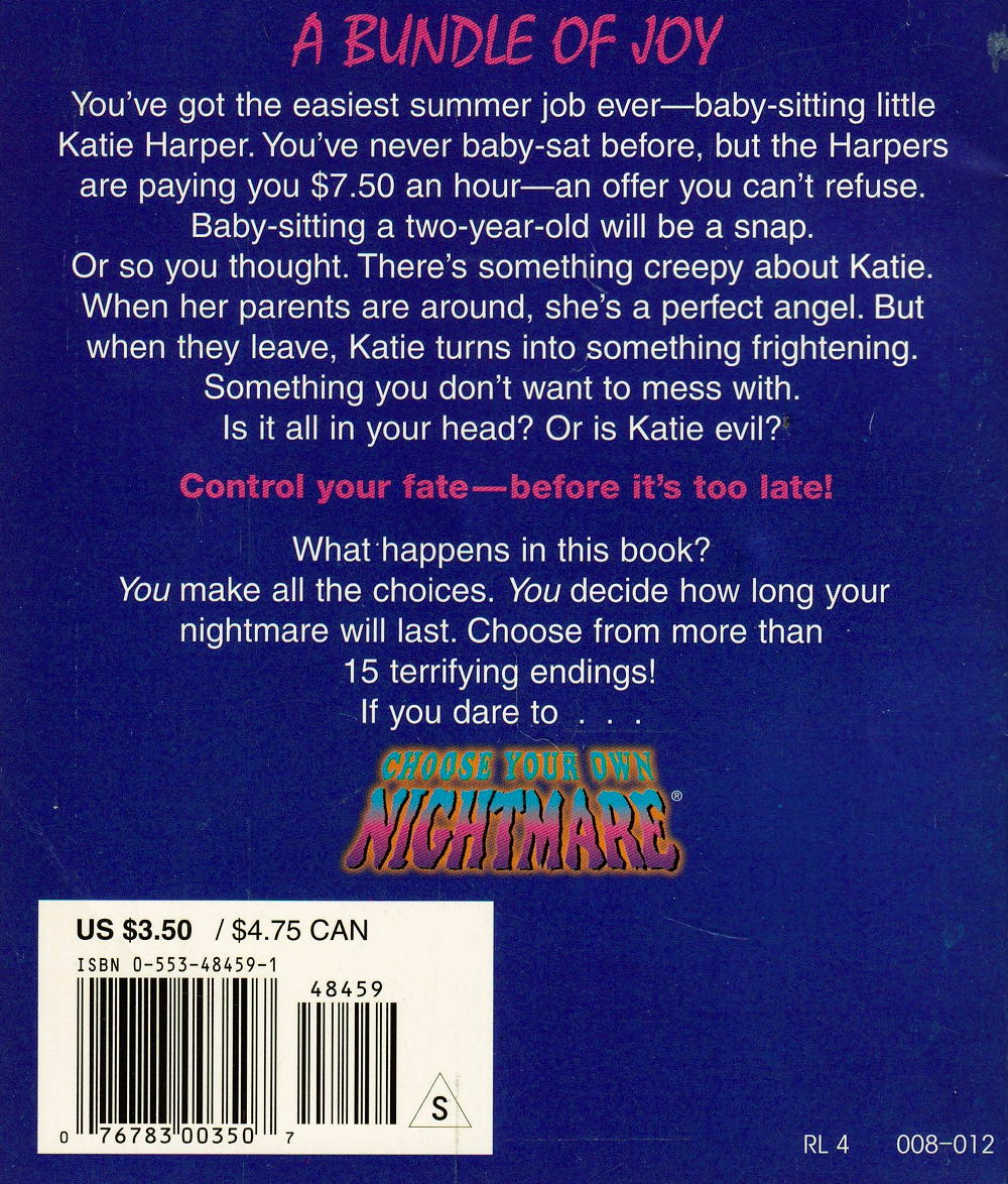 You've got the easiest summer job ever-baby-sitting little Katie Harper. You've never baby-sat before, but the Harpers are paying you $7.50 an hour-an offer you can't refuse. Baby-sitting a two-year-old will be a snap. Or so you thought. There's something creepy about Katie. When her parents are around, she's a perfect angel. But when they leave, Katie turns into something frightening. Something you don't want to mess with. Is it all in your head? Or is Katie evil? Control your fate-before it's too late!