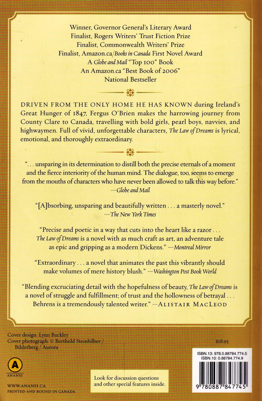 during Ireland's Great Hunger of 1847, Fergus O'Brien makes the harrowing journey from County Clare to Canada, travelling with bold girls, pearl boys, navvies, and highwaymen. Full of vivid, unforgettable characters, The Law of Dreams is lyrical, emotional, and thoroughly extraordinary.