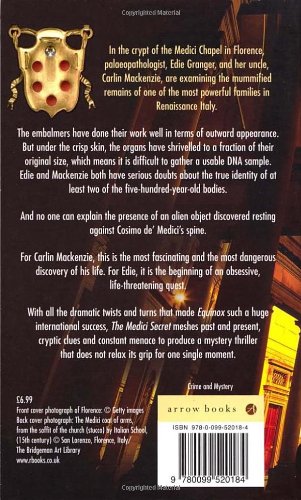With all the dramatic twists and turns that made EQUINOX such a huge international success, THE MEDICI SECRET meshes past and present, cryptic clues and constant menace to produce a mystery thriller that does not relax its grip for one single moment.