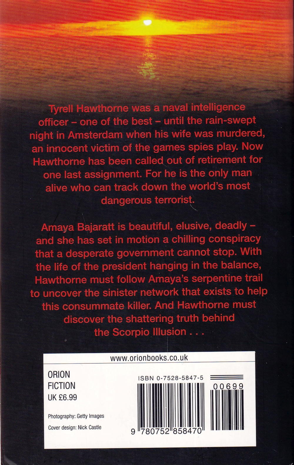 Amaya Bajaratt is beautiful, elusive, deadly and she has set in motion a chilling conspiracy that a desperate government cannot stop. With the life of the president hanging in the balance, Hawthorne must follow Amaya's serpentine trail to uncover the sinister network that exists to help this consummate killer. And Hawthorne must discover the shattering truth behind the Scorpio IlIlusion...
