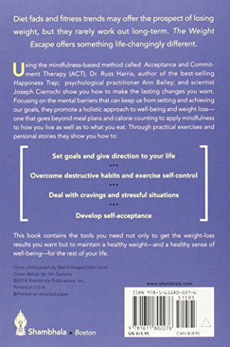 Diet fads and fitness trends may offer the prospect of losing weight, but they rarely work out long-term. The Weight Escape offers something life-changingly different. Using the mindfulness-based method called Acceptance and Commitment Therapy (ACT), Dr. Russ Harris, author of the best-selling Happiness Trap; psychological practitioner Ann Bailey; and scientist Joseph Ciarrochi show you how to make the lasting changes you want. Focusing on the mental barriers that can keep us from setting and achieving our goals, they promote a holistic approach to well-being and weight loss—one that goes beyond meal plans and calorie counting to apply mindfulness to how you live as well as to what you eat. Through practical exercises and personal stories they show you how to: •••Set goals and give direction to your life