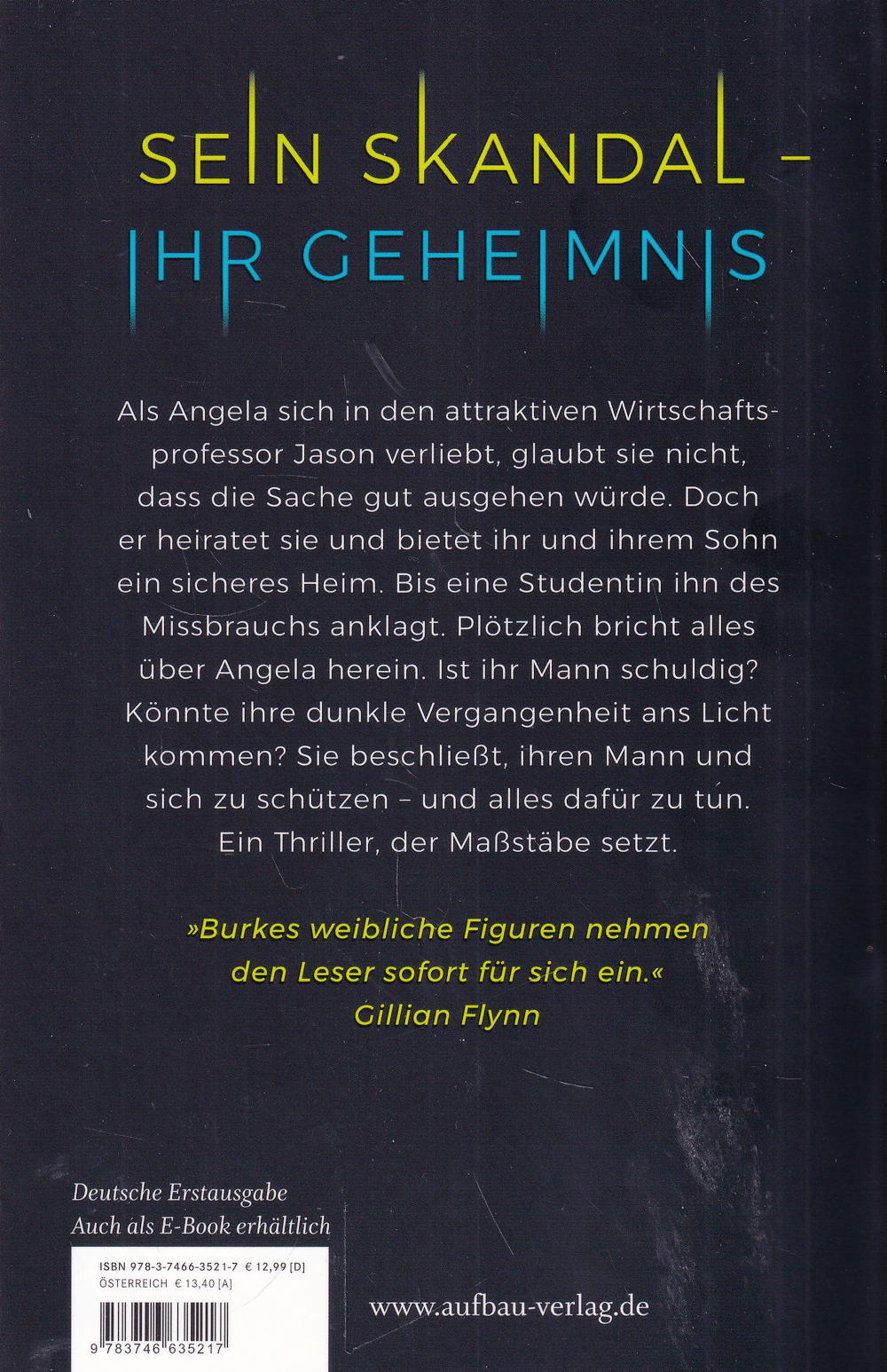 Als Angela den attraktiven Jason Powell trifft, denkt sie nicht, dass der renommierte Wirtschaftsprofessor sich für sie interessieren könnte, doch zu ihrer Überraschung verliebt sich Jason in sie. Er heiratet sie und nimmt ihren Sohn auf, als wäre es sein eigener. Endlich glaubt Angela, ihre dunkle Vergangenheit hinter sich lassen zu können. Sechs Jahre später ist Jason dank eines Buches zu einem Star geworden – und eine junge Studentin wirft ihm vor, sie sexuell belästigt zu haben. Jason behauptet, unschuldig zu sein, aber dann verschwindet die Studentin spurlos, und Angela wird in einen Strudel aus Schuld und Verdächtigungen gezogen. Ein Thriller, der Massstäbe setzt. „Burkes weibliche Figuren nehmen den Leser sofort für sich ein. “ Gillian Flynn