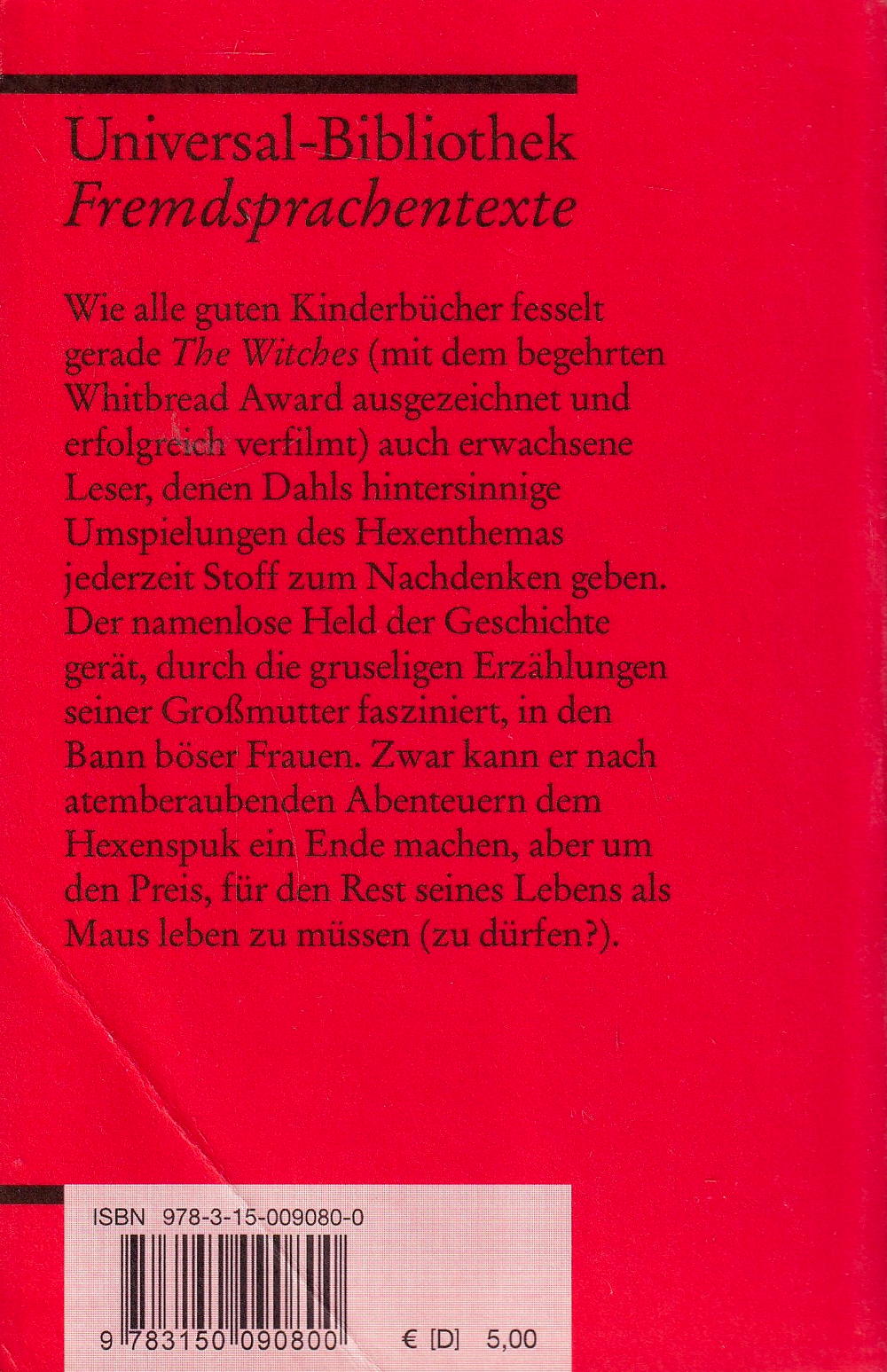 Wie alle guten Kinderbücher fesselt gerade The Witches (mit dem begehrten Whitbread Award ausgezeichnet und erfolgreich verfilmt) auch erwachsene Leser, denen Dahls hintersinnige Umspielungen des Hexenthemas jederzeit Stoff zum Nachdenken geben. Der namenlose Held der Geschichte gerät, durch die gruseligen Erzählungen seiner Grossmutter fasziniert, in den Bann böser Frauen. Zwar kann er nach atemberaubenden Abenteuern dem Hexenspuk ein Ende machen, aber um den Preis, für den Rest seines Lebens als Maus leben zu müssen (zu dürfen?).