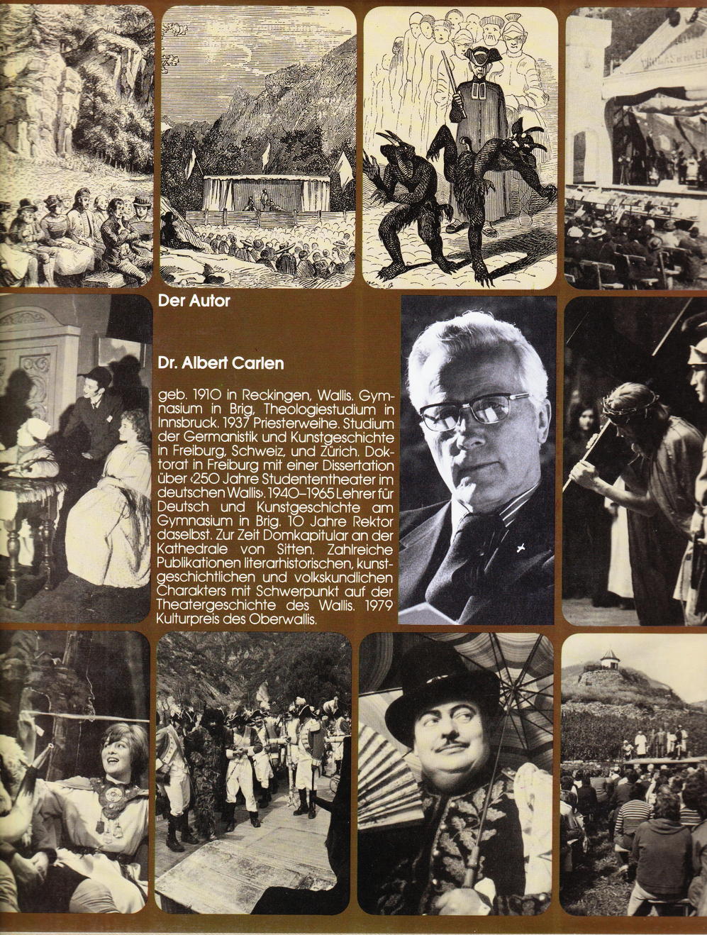 Dr. Albert Carlen geb. 1910 in Reckingen, Wallis. Gymnasium in Brig, Theologiestudium in Innsbruck. 1937 Priesterweihe. Studium der Germanistik und Kunstgeschichte in Freiburg, Schweiz, und Zurich. Doktorat in Freiburg mit einer Dissertation über 250 Jahre Studententheater im deutschen Wallis. 1940-1965 Lehrer für Deutsch und Kunstgeschichte am Gymnasium in Brig. 10 Jahre Rektor daselbst. Zur Zeit Domkapitular an der Kathedrale von Sitten. Zahlreiche Publikationen literarhistorischen, kunstgeschichtlichen und volkskundlichen Charakters mit Schwerpunkt auf der Theatergeschichte des Wallis. 1979 Kulturpreis des Oberwallis.