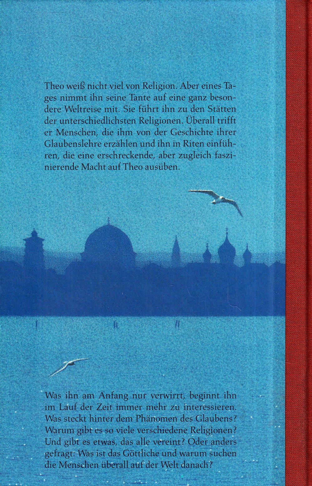 Theo weiss nicht viel von Religion. Aber eines Tages nimmt ihn seine Tante auf eine ganz besondere Weltreise mit. Sie führt ihn zu den Stätten der unterschiedlichsten Religionen. Überall trifft er Menschen, die ihm von der Geschichte ihrer Glaubenslehre erzählen und ihn in Riten einführen, die eine erschreckende, aber zugleich faszinierende Macht auf Theo ausüben.