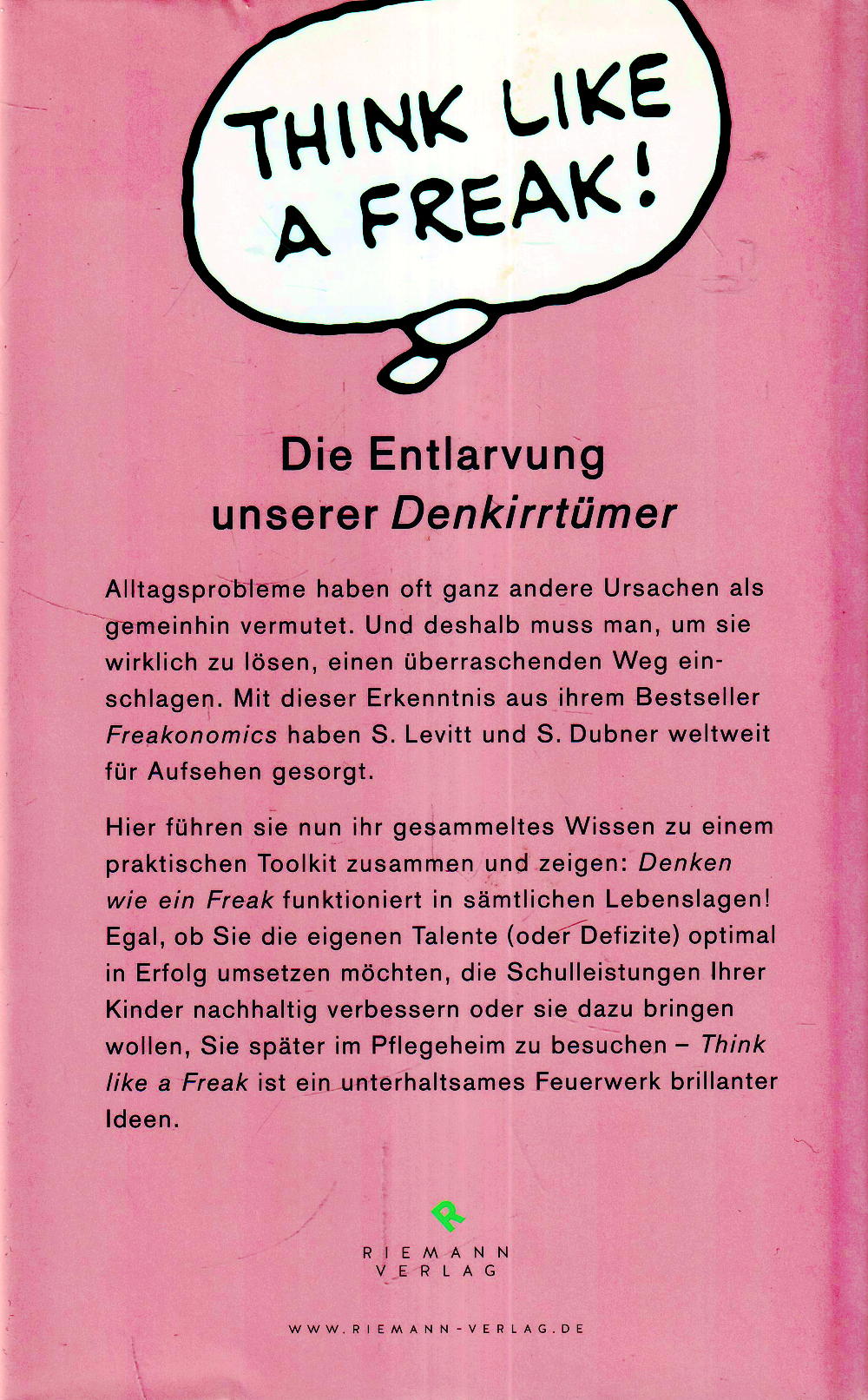 Die Entlarvung der typischen Denkirrtümer Alltagsprobleme haben oft ganz andere Ursachen als gemeinhin vermutet. Und deshalb muss man, um sie wirklich zu lösen, einen überraschenden Weg einschlagen. Mit dieser Erkenntnis aus ihrem Bestseller Freakonomics haben Levitt und Dubner weltweit Aufsehen erregt. In diesem Buch führen sie alles, was sie an ihren Fallgeschichten gelernt haben, zu einem praktischen Toolkit zusammen. Das Denken-wie-ein-Freak bewährt sich überall: wenn Sie die eigenen Talente (oder Defizite) optimal in beruflichen Erfolg umsetzen, die Schulleistungen Ihrer Kinder nachhaltig verbessern und auch noch, wenn Sie Ihre Kinder dazu bringen wollen, Sie später im Alter im Pflegeheim zu besuchen. Think Like a Freak ist wieder ein unterhaltsames Feuerwerk brillanter Ideen. Diesmal aber mit unmittelbarem Praxisnutzen.