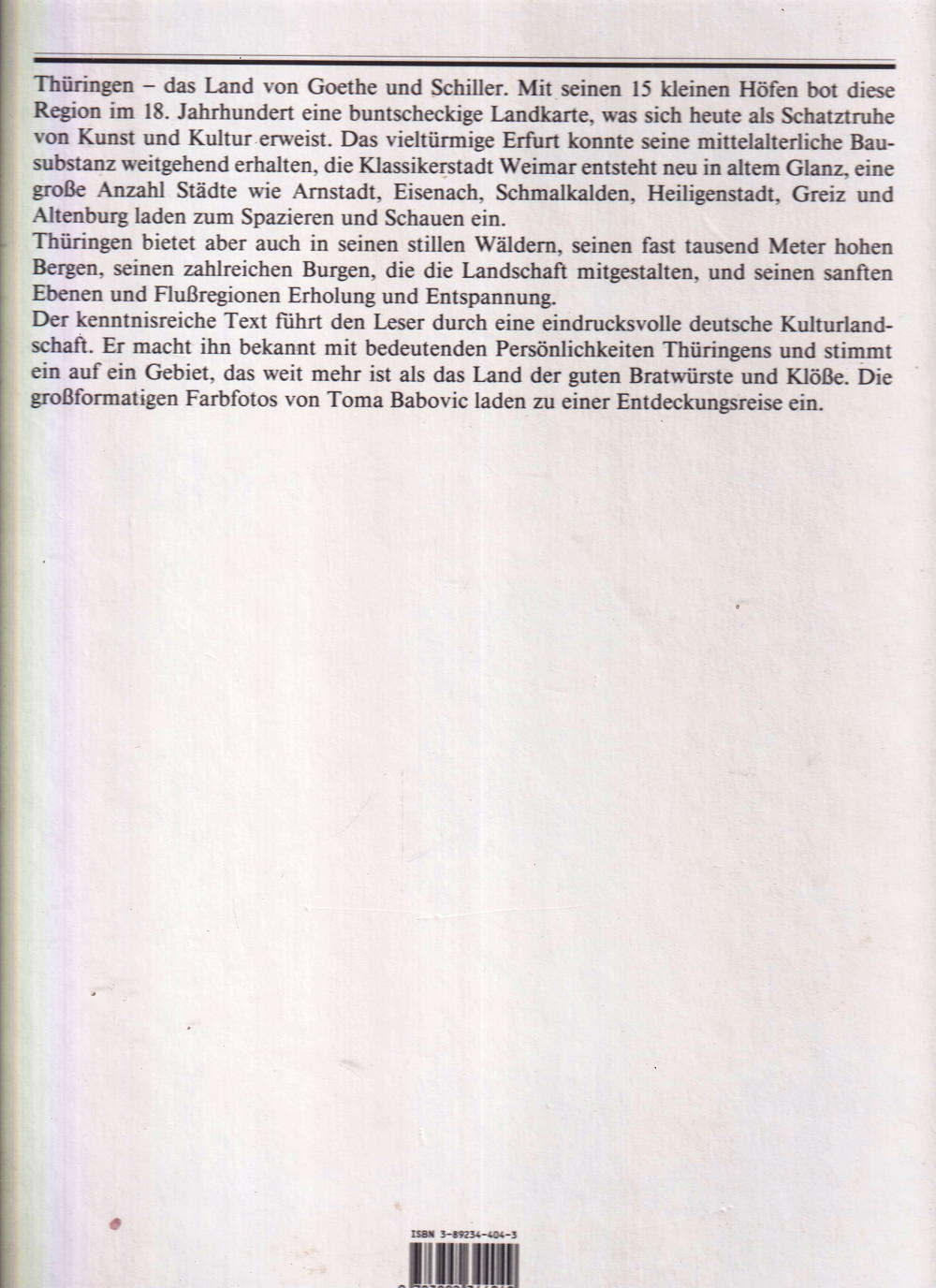 Der kenntnisreiche Text führt den Leser durch eine eindrucksvolle deutsche Kulturlandschaft. Er macht ihn bekannt mit bedeutenden Persönlichkeiten Thüringens und stimmt ein auf ein Gebiet, das weit mehr ist als das Land der guten Bratwürste und Klösse. Die grossformatigen Farbfotos von Toma Babovic laden zu einer Entdeckungsreise ein.