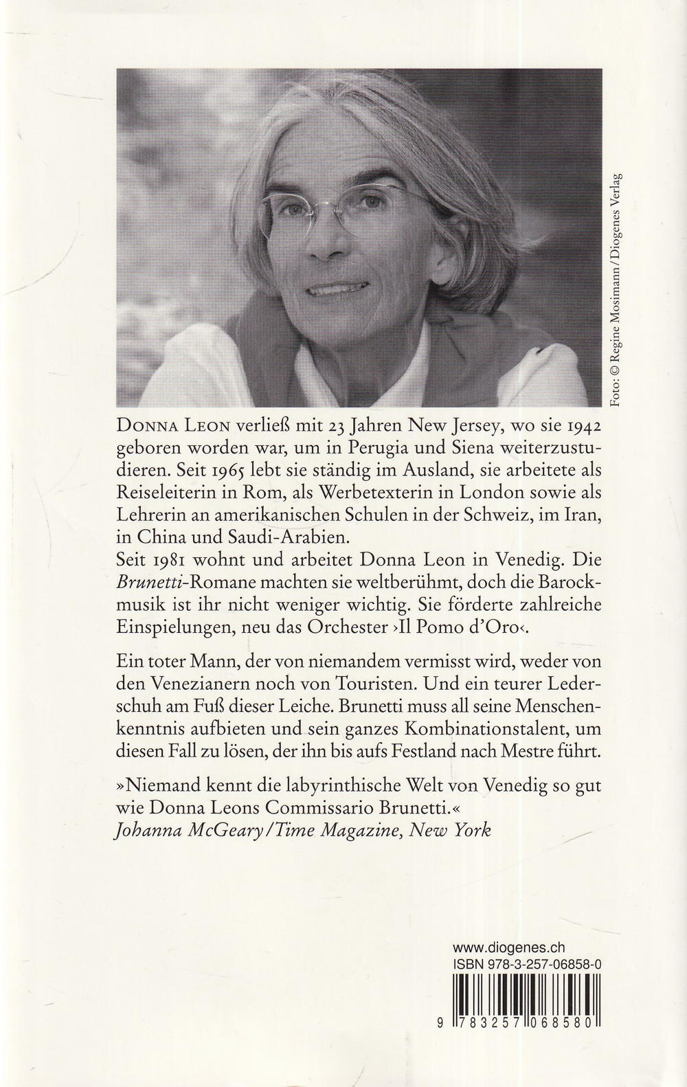 Donna Leon, geboren 1942 in New Jersey, lebt seit 1965 im Ausland. Sie arbeitete als Reiseleiterin in Rom, als Werbetexterin in London sowie als Lehrerin an amerikanischen Schulen in der Schweiz, im Iran, in China und Saudi-Arabien. 1981 zog Donna Leon nach Venedig. Die ›Brunetti‹-Romane machten sie weltberühmt, doch die Barockmusik ist ihr nicht weniger wichtig. Sie förderte zahlreiche Einspielungen, neu das Orchester ›Il Pomo d’Oro‹. Heute lebt sie in der Schweiz und in Venedig.