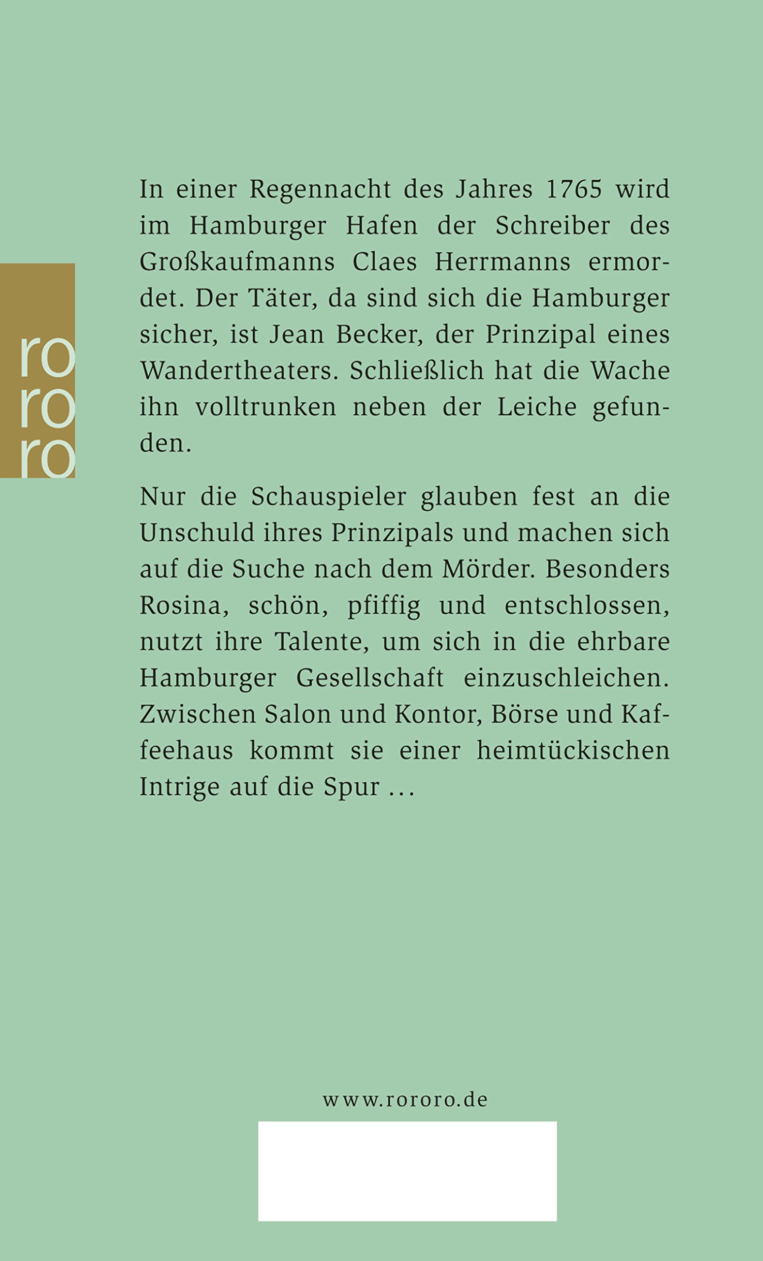 Nur die Schauspieler glauben fest an die Unschuld ihres Prinzipals und machen sich auf die Suche nach dem Mörder. Besonders Rosina, schön, pfiffig und entschlossen, nutzt ihre Talente, um sich in die ehrbare Hamburger Gesellschaft einzuschleichen. Zwischen Salon und Kontor, Börse und Kaffeehaus kommt sie einer heimtückischen Intrige auf die Spur ...