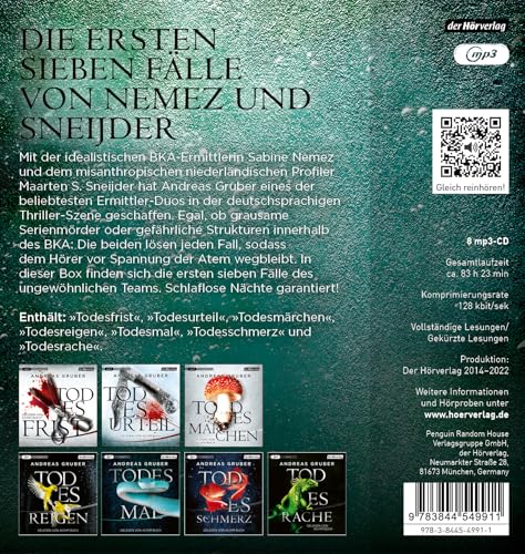 Mit der idealistischen BKA-Ermittlerin Sabine Nemez und dem misanthropischen niederländischen Profiler Maarten S. Sneijder hat Andreas Gruber eines der beliebtesten Ermittler-Duos in der deutschsprachigen Thriller-Szene geschaffen. Egal, ob grausame Serienmörder oder gefährliche Strukturen innerhalb des BKA: Die beiden lösen jeden Fall, sodass dem Hörer vor Spannung der Atem wegbleibt. In dieser Box finden sich die ersten sieben Fälle des ungewöhnlichen Teams. Schlaflose Nächte garantiert!