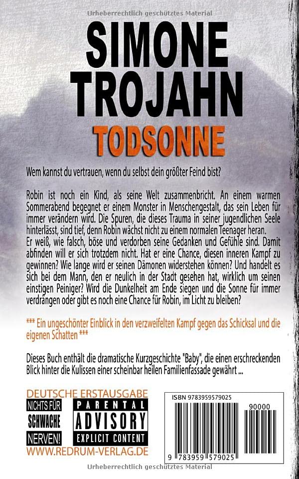 Zum Buch: Wem kannst du vertrauen, wenn du selbst dein grösster Feind bist? Robin ist noch ein Kind, als seine Welt zusammenbricht. An einem warmen Sommerabend begegnet er einem Monster in Menschengestalt, das sein Leben für immer verändern wird. Die Spuren, die dieses Trauma in seiner jugendlichen Seele hinterlässt, sind tief, denn Robin wächst nicht zu einem normalen Teenager heran. Er weiss, wie falsch, böse und verdorben seine Gedanken und Gefühle sind. Damit abfinden will er sich trotzdem nicht. Hat er eine Chance, diesen inneren Kampf zu gewinnen? Wie lange wird er seinen Dämonen widerstehen können? Und handelt es sich bei dem Mann, den er neulich in der Stadt gesehen hat, wirklich um seinen einstigen Peiniger? Wird die Dunkelheit am Ende siegen und die Sonne für immer verdrängen oder gibt es noch eine Chance für Robin, im Licht zu bleiben?