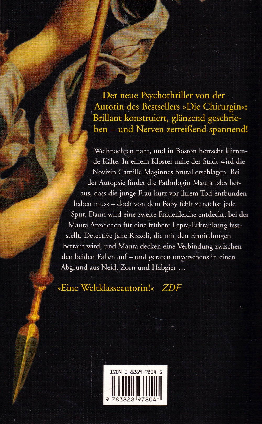 Weihnachten naht, und in Boston herrscht klirrende Kälte. In einem Kloster nahe der Stadt wird die Novizin Camille Maginnes brutal erschlagen. Bei der Autopsie findet die Pathologin Maura Isles heraus, dass die junge Frau kurz vor ihrem Tod entbunden haben muss – doch von dem Baby fehlt zunächst jede -Spur. Dann wird eine zweite Frauenleiche entdeckt, bei der Maura Anzeichen für eine frühere Lepra-Erkrankung feststellt. Detective Jane Rizzoli, die mit den Ermittlungen betraut wird, und Maura decken eine Verbindung zwischen den beiden Fällen auf – und geraten unversehens in einen Abgrund aus Neid, Zorn und Habgier...
