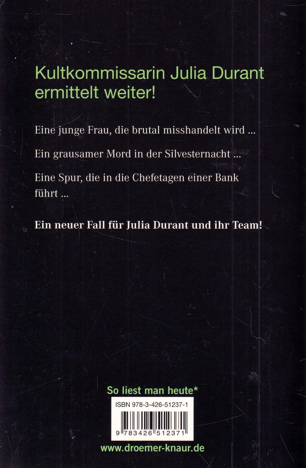 Frankfurt, Neujahr 2011: Während man überall noch im Silvesterrausch ist, passiert, unbemerkt von allen, ein grausamer Mord: Eine junge Frau wird verprügelt, vergewaltigt, erdrosselt und schliesslich in einem Müllcontainer unweit des Bankenviertels entsorgt. Erste Spuren werden sichergestellt, sogar DNA gefunden, die Ermittlungen führen hinauf in die Chefetagen einer renommierten Bank. Der Verdächtige ist stur, verweigert die Aussage und verbirgt sich hinter einer Armada von Anwälten. Schuldig? Da passiert ein zweiter Mord ... Eine neue Herausforderung für Julia Durant und ihr Team!