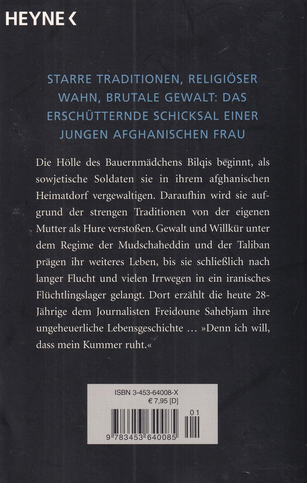 Die Hölle des Bauernmädchens Bilqis beginnt, als sowjetische Soldaten sie in ihrem afghanischen Heimatdorf vergewaltigen. Daraufhin wird sie aufgrund der strengen Traditionen von der eigenen Mutter als Hure verstossen. Gewalt und Willkür unter dem Regime der Mudschaheddin und der Taliban prägen ihr weiteres Leben, bis sie schliesslich nach langer Flucht und vielen Irrwegen in ein iranisches Flüchtlingslager gelangt. Dort erzählt die heute 28-Jährige dem Journalisten Freidoune Sahebjam ihre ungeheuerliche Lebensgeschichte... »Denn ich will, dass mein Kummer ruht. «