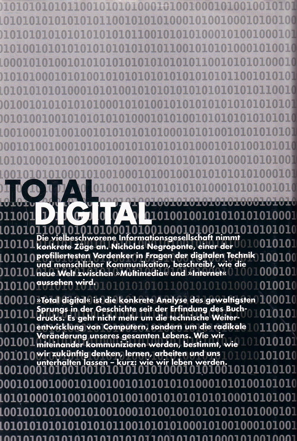 »Total digital« ist die konkrete Analyse des gewaltigsten Sprungs in der Geschichte seit der Erfindung des Buchdrucks. Es geht nicht mehr um die technische Weiterentwicklung von Computern, sondern um die radikaleVeränderung unseres gesamten Lebens. Wie wir miteinander kommunizieren werden, bestimmt, wie wir zukünftig denken, lernen, arbeiten und uns unterhalten lassen - kurz: wie wir leben werden.