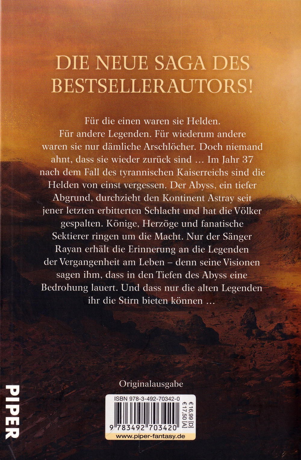 Für die einen waren sie Helden. Für andere Legenden. Für wiederum andere waren sie nur dämliche Arschlöcher. Doch niemand ahnt, dass sie wieder zurück sind … Im Jahr 37 nach dem Fall des tyrannischen Kaiserreichs sind die Helden von einst vergessen. Der Abyss, ein tiefer Abgrund, durchzieht den Kontinent Astray seit jener letzten erbitterten Schlacht und hat die Völker gespalten. Könige, Herzöge und fanatische Sektierer ringen um die Macht. Nur der Sänger Rayan erhält die Erinnerung an die Legenden der Vergangenheit am Leben – denn seine Visionen sagen ihm, dass in den Tiefen des Abyss eine Bedrohung lauert. Und dass nur die alten Legenden ihr die Stirn bieten können …