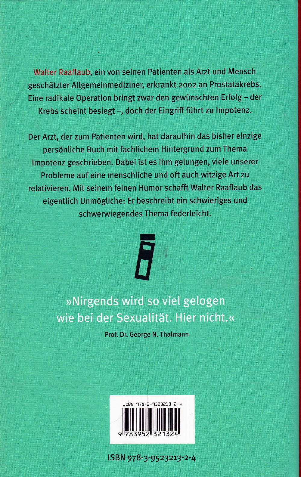 Walter Raaflaub, ein von seinen Patienten als Arzt und Mensch geschätzter Allgemeinmediziner, erkrankt 2002 an Prostatakrebs. Eine radikale Operation bringt zwar den gewünschten Erfolg – der Krebs scheint besiegt –, doch der Eingriff führt zu Impotenz. Der Arzt, der zum Patienten wird, hat daraufhin das bisher einzige persönliche Buch mit fachlichem Hintergrund zum Thema Impotenz geschrieben. Dabei ist es ihm gelungen, viele unserer Probleme auf eine menschliche und oft auch witzige Art zu relativieren. Mit seinem feinen Humor schafft Walter Raaflaub das eigentlich Unmögliche: Er beschreibt ein schwieriges und schwerwiegendes Thema federleicht.