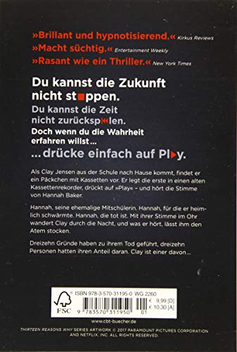 Als Clay Jensen aus der Schule nach Hause kommt, findet er ein Päckchen mit Kassetten vor. Er legt die erste in einen alten Kassettenrekorder, drückt auf »Play« – und hört die Stimme von Hannah Baker. Hannah, seine ehemalige Mitschülerin. Hannah, für die er heimlich schwärmte. Hannah, die tot ist. Mit ihrer Stimme im Ohr wandert Clay durch die Nacht, und was er hört, lässt ihm den Atem stocken. Dreizehn Gründe haben zu ihrem Tod geführt, dreizehn Personen hatten ihren Anteil daran. Clay ist einer davon...Mit exklusivem Fotomaterial zur Netflix-Serie, produziert von Selena Gomez!