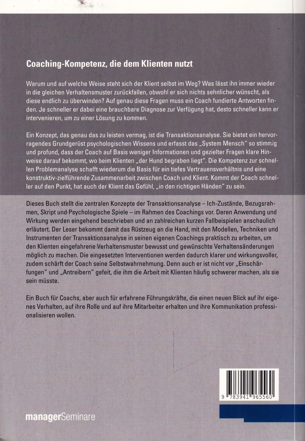Coachs müssen sich ständig in ihrem Beruf beweisen. Nicht nur auf dem freien Markt, sondern auch, wenn sie in den Coaching-Pools der grossen Konzerne gelistet sind, denn nicht selten erhält der Coachee von der Wer als Coach einen Auftrag erhalten will, sollte bereits im ersten Kennenlern-Gespräch eine gewisse Bedeutsamkeit aufbauen. Der Coachee sollte merken, dass man zu einer treffsicheren Einschätzung seiner Situation imstande ist und ihm schon einige neue Blickwinkel anbieten kann. Die Transaktionsanalyse bietet hier ausgezeichnete Tools, um frühzeitig zu verstehen, was eigentlich los ist und darauf aufbauend gezielte Fragen zu stellen. Der Coachee fasst rasch Vertrauen, wenn er spürt, dass da jemand nicht einfach im Nebel herumstochert, sondern ihn versteht und offenbar weiss, was er tut. Dieses Werk stellt Ihnen zahlreiche Möglichkeiten der praktischen Anwendung des Modells vor.