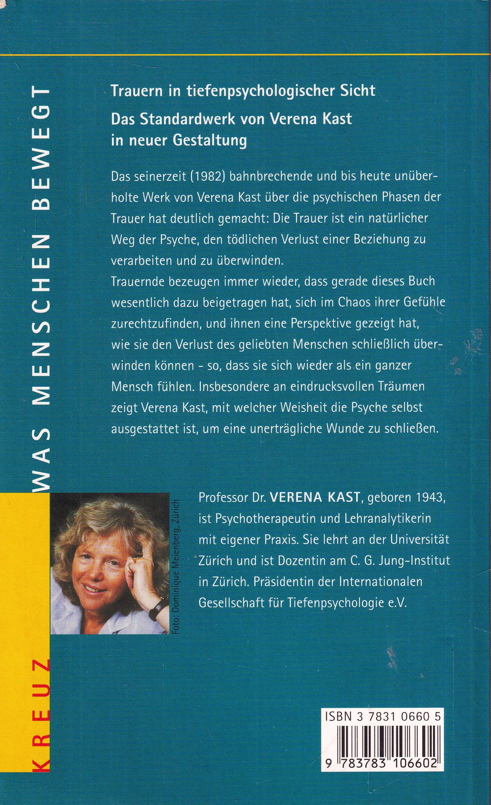 Trauernde bezeugen immer wieder, dass gerade dieses Buch wesentlich dazu beigetragen hat, sich im Chaos ihrer Gefühle zurechtzufinden, und ihnen eine Perspektive gezeigt hat, wie sie den Verlust des geliebten Menschen schliesslich überwinden können - so, dass sie sich wieder als ein ganzer Mensch fühlen. Insbesondere an eindrucksvollen Träumen zeigt Verena Kast, mit welcher Weisheit die Psyche selbst ausgestattet ist, um eine unerträgliche Wunde zu schliessen.