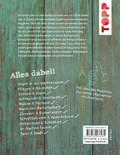 Geniale Lifehacks für Hobbygärtner, Pflanzenfreunde, Blumenliebhaber, Gartenumbuddler, Balkonbegrüner und Outdoor-Partymacher. 222 knackige Alltagstipps für alle Lebenslagen machen das Leben leichter. Gartenprofi Antje Krause hat Wissenwertes und Witziges gesammelt und getestet: Aus Eierpappen werden Anzuchtsbecher, aus Duschringen Rankhilfen, aus Garnknäulen Blumenvasen, aus Gemüse & Co eine Mini-Golfbahn. Die originelle und hilfreiche Sammlung ist durchweg farbig bebildert, besticht durch ein hochwertiges, modernes Layout und eignet sich auch bestens zum Verschenken.