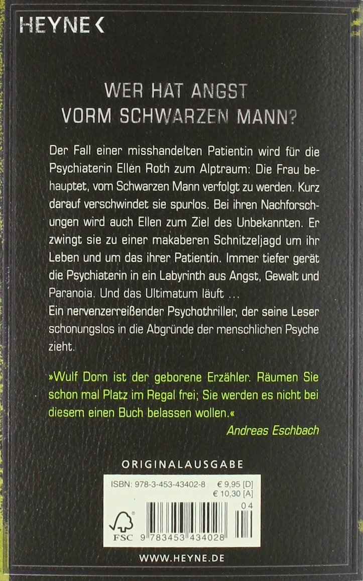 Der Fall einer misshandelten Patientin wird für die Psychiaterin Ellen Roth zum Alptraum: Die Frau behauptet, vom Schwarzen Mann verfolgt zu werden. Kurz darauf verschwindet sie spurlos. Bei ihren Nachforschungen wird auch Ellen zum Ziel des Unbekannten. Er zwingt sie zu einer makaberen Schnitzeljagd um ihr Leben und um das ihrer Patientin. Für Ellen beginnt ein verzweifelter Kampf, bei dem sie niemandem mehr trauen kann. Immer tiefer gerät die Psychiaterin in ein Labyrinth aus Angst, Gewalt und Paranoia.
