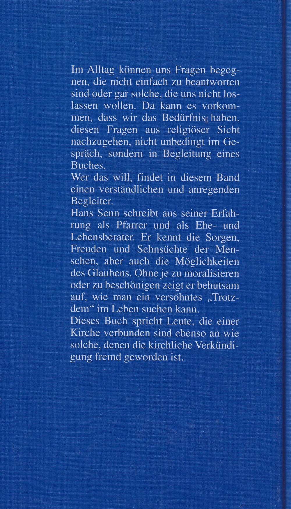 Hans Senn schreibt aus seiner Erfahrung als Pfarrer und als Ehe- und Lebensberater. Er kennt die Sorgen, Freuden und Sehnsüchte der Menschen, aber auch die Möglichkeiten des Glaubens. Ohne je zu moralisieren oder zu beschönigen zeigt er behutsam auf, wie man ein versöhntes "Trotzdem" im Leben suchen kann.