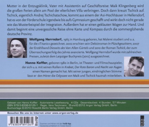 Tschick, eigentlich Andrej Tschichatschow, kommt aus einem der Asi-Hochhäuser in Hellersdorf, hat es von der Förderschule irgendwie bis aufs Gymnasium geschafft und wirkt doch nicht gerade wie das Musterbeispiel der Integration. Ausserdem hat er einen geklauten Wagen zur Hand. Und damit beginnt eine unvergessliche Reise ohne Karte und Kompass durch die sommerglühende deutsche Provinz.