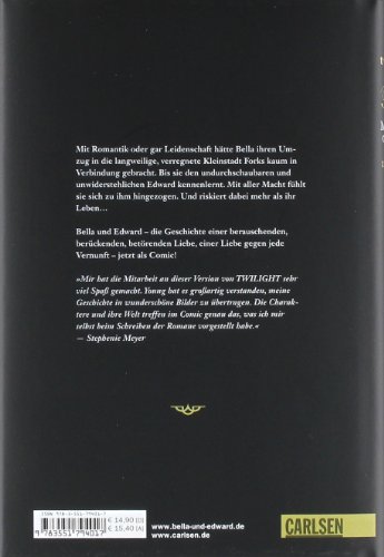 In "Twilight: Biss zum Morgengrauen - der Comic" verwandelte die koreanische Zeichnerin Young Kim Stephenie Meyers Worte in eine packende Comicgeschichte, die in stimmungsvollen Bildern von Bellas und Edwards Leben in Forks erzählt. Mit Romantik oder gar Leidenschaft hätte Bella ihren Umzug nach Forks, einer langweiligen, ständig verregneten Kleinstadt in Washington State, kaum in Verbindung gebracht. Bis sie den geheimnisvollen und attraktiven Edward kennen lernt. Er fasziniert sie, obwohl irgendetwas mit ihm nicht zu stimmen scheint. So gut aussehend und stark wie er kann kein gewöhnlicher Mensch sein. Aber was ist er dann? Die Geschichte einer verbotenen Liebe, einer Liebe gegen alle Vernunft. Die so viele Hindernisse überwinden muss, dass man auf jeder Seite mitfiebert. So romantisch und spannend, dass dem Leser bei diesem wunderschön geschriebenen Buch eine Gänsehaut über den Rücken läuft. Der zweite, abschliessende Band ist bereits in Vorbereitung.