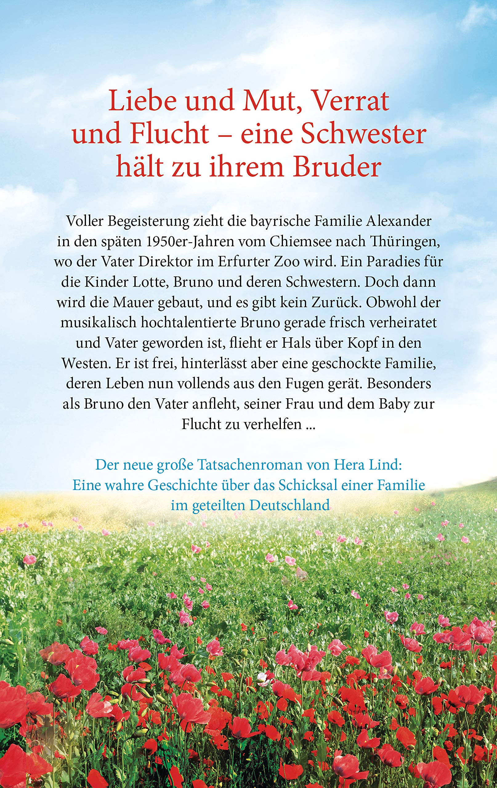 Voller Begeisterung zieht die bayrische Familie Alexander in den späten 1950er-Jahren vom Chiemsee nach Thüringen, wo der Vater Direktor im Erfurter Zoo wird. Ein Paradies für die Kinder Lotte, Bruno und deren Schwestern. Doch dann wird die Mauer gebaut, und es gibt kein Zurück. Obwohl der musikalisch hochtalentierte Bruno gerade frisch verheiratet und Vater geworden ist, flieht er Hals über Kopf in den Westen. Er ist frei, hinterlässt aber eine geschockte Familie, deren Leben nun vollends aus den Fugen gerät. Besonders als Bruno den Vater anfleht, seiner Frau und dem Baby zur Flucht zu verhelfen ...