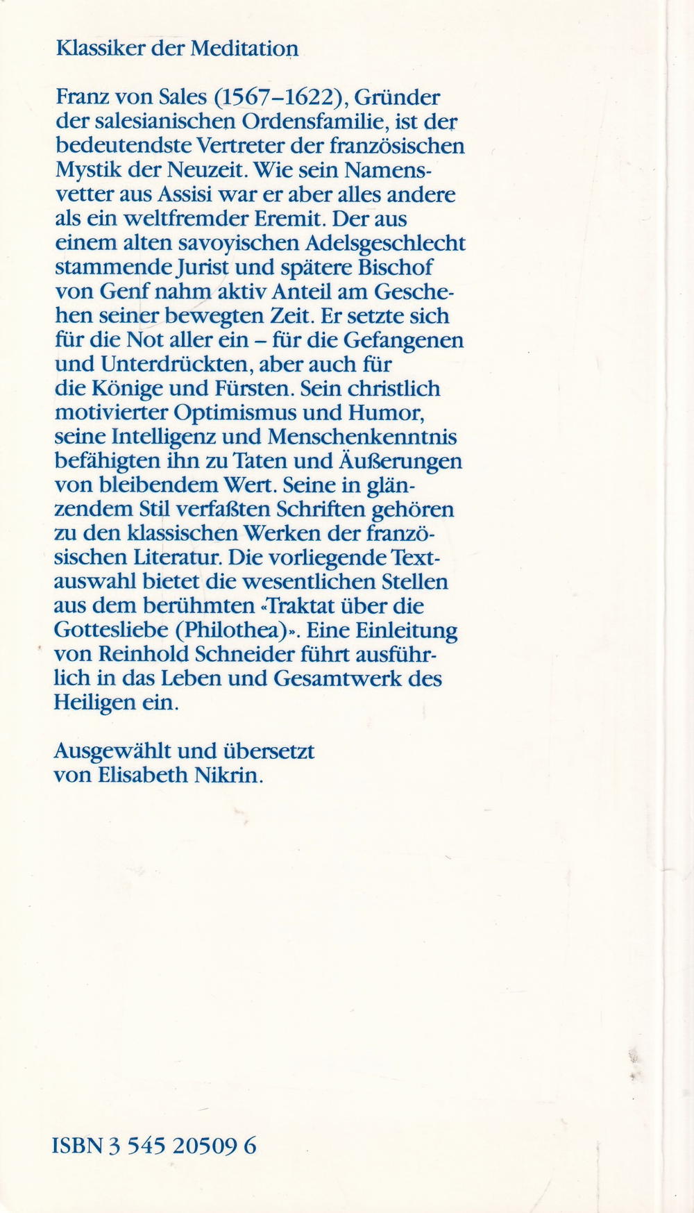 Franz von Sales (1567–1622), Gründer der salesianischen Ordensfamilie, ist der bedeutendste Vertreter der französischen Mystik der Neuzeit. Wie sein Namensvetter aus Assisi war er aber alles andere als ein weltfremder Eremit. Der aus einem alten savoyischen Adelsgeschlecht stammende Jurist und spätere Bischof von Genf nahm aktiv Anteil am Geschehen seiner bewegten Zeit. Er setzte sich für die Not aller ein – für die Gefangenen und Unterdrückten, aber auch für die Könige und Fürsten. Sein christlich motivierter Optimismus und Humor, seine Intelligenz und Menschenkenntnis befähigten ihn zu Taten und Äusserungen von bleibendem Wert. Seine in glänzendem Stil verfassten Schriften gehören zu den klassischen Werken der französischen Literatur. Die vorliegende Textauswahl bietet die wesentlichen Stellen aus dem berühmten -Traktat über die Gottesliebe (Philothea) ». Eine Einleitung von Reinhold Schneider führt ausführlich in das Leben und Gesamtwerk des Heiligen ein.