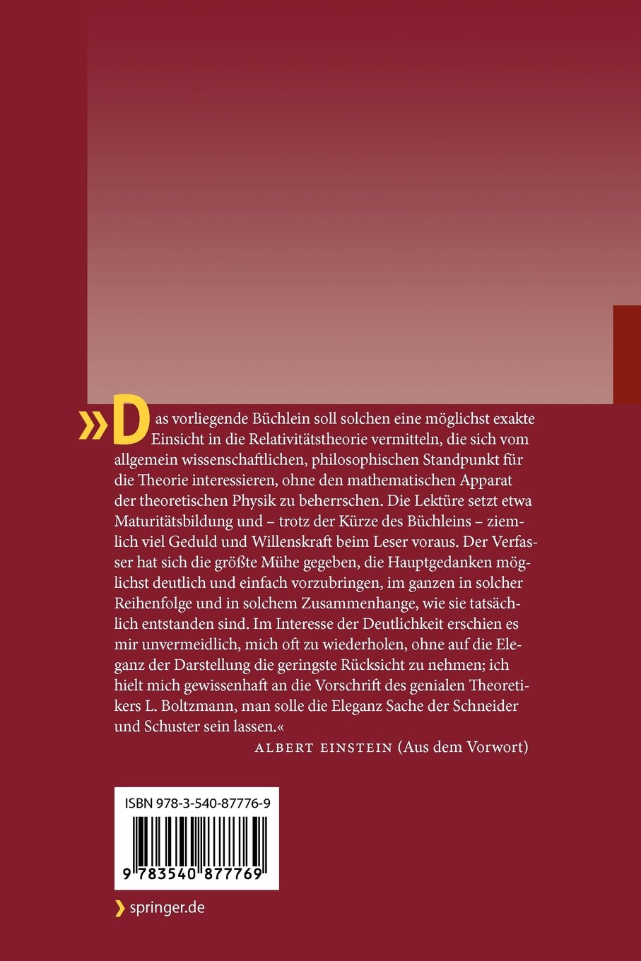 Das vorliegende Buchlein soll solchen eine moglichst exakte Einsicht in die Relativitatstheorie vermitteln, die sich vom allgemein wissenschaftlichen, philosophischen Standpunkt fur die Theorie interessieren, ohne den mathematischen Apparat der theoretischen Physik zu beherrschen. Der Verfasser hat sich die grobte Muhe gegeben, die Hauptgedanken moglichst deutlich und einfach vorzubringen, im ganzen in solcher Reihenfolge und in solchem Zusammenhange, wie sie tatsachlich entstanden sind (Aus dem Vorwort).