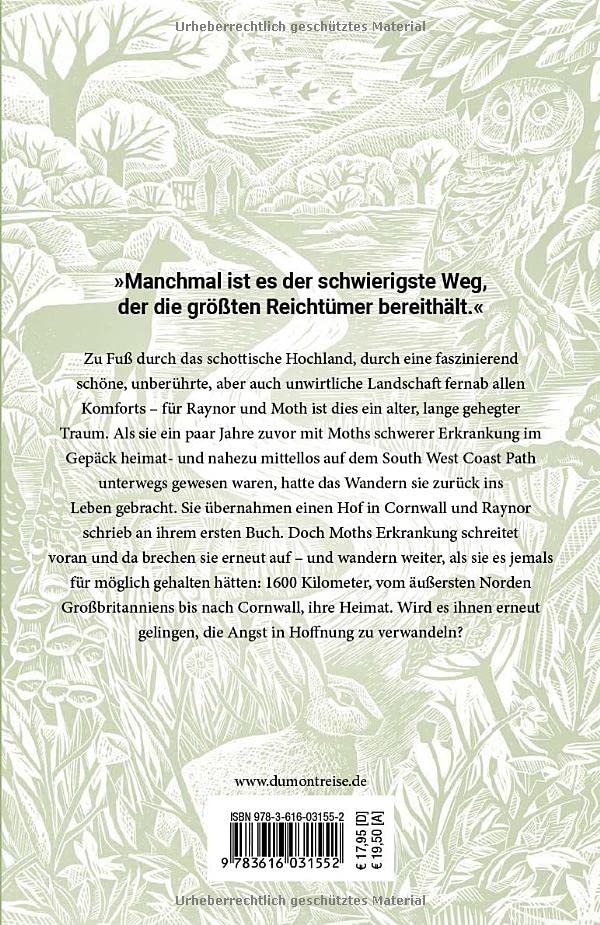 Die Geschichte von Raynor und Moth geht weiter: Nachdem sie Haus und Hof verloren hatten und den über 1000 Kilometer langen South West Coast Path gewandert waren, fanden sie in einer Farm in Wales eine neue Heimat. Moths Gesundheit stabilisierte sich, die Farm zu neuem Leben zu erwecken, war Herausforderung und Glück zugleich. Doch Stillstand ist keine Option für die beiden und so brechen sie erneut zu einer grossen Wanderung auf, die sie erst durch das schottische Hochland und dann durch die schönsten und wildesten Landstriche Englands führt. Die Umstände sind andere als vor ein paar Jahren, doch die Fragen an das Leben, Raynors Glaube an die heilende Wirkung der Natur und die Liebe zwischen ihr und Moth sind geblieben. Ein Buch, das Mut macht!