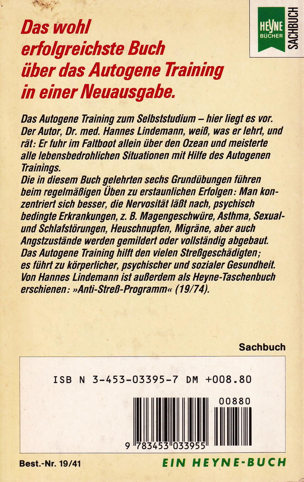 Das Autogene Training hilft den vielen Stressgeschädigten; es führt zu körperlicher, psychischer und sozialer Gesundheit. Von Hannes Lindemann ist ausserdem als Heyne-Taschenbuch erschienen: Anti-Stress-Programm (19/74).