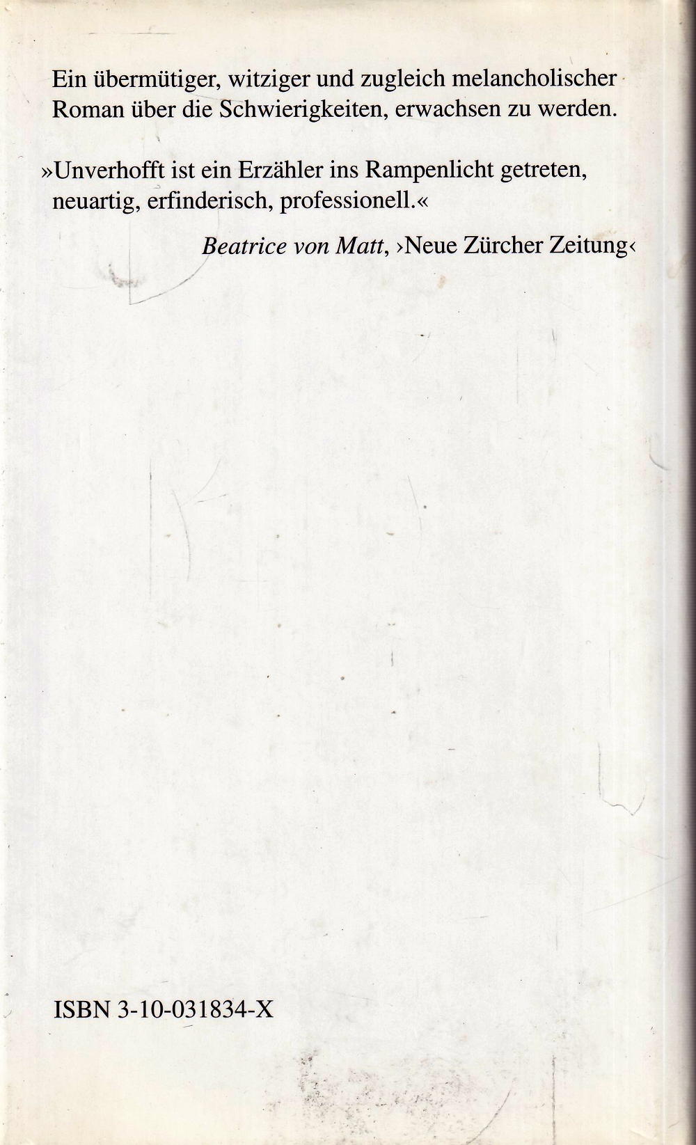 Ein übermütiger, witziger und zugleich melancholischer Roman über die Schwierigkeiten, erwachsen zu werden. »Unverhofft ist ein Erzähler ins Rampenlicht getreten, neuartig, erfinderisch, professionell. « Beatrice von Matt,> Neue Zürcher Zeitung <