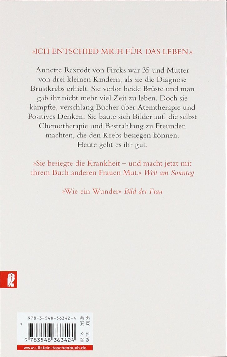 Annette Rexrodt von Fircks war 35 und Mutter von drei kleinen Kindern, als sie die Diagnose Brustkrebs erhielt. Sie verlor beide Brüste und man gab ihr nicht mehr viel Zeit zu leben. Doch sie kämpfte, verschlang Bücher über Atemtherapie und Positives Denken. Sie baute sich Bilder auf, die selbst Chemotherapie und Bestrahlung zu Freunden machten, die den Krebs besiegen können. Heute geht es ihr gut.
