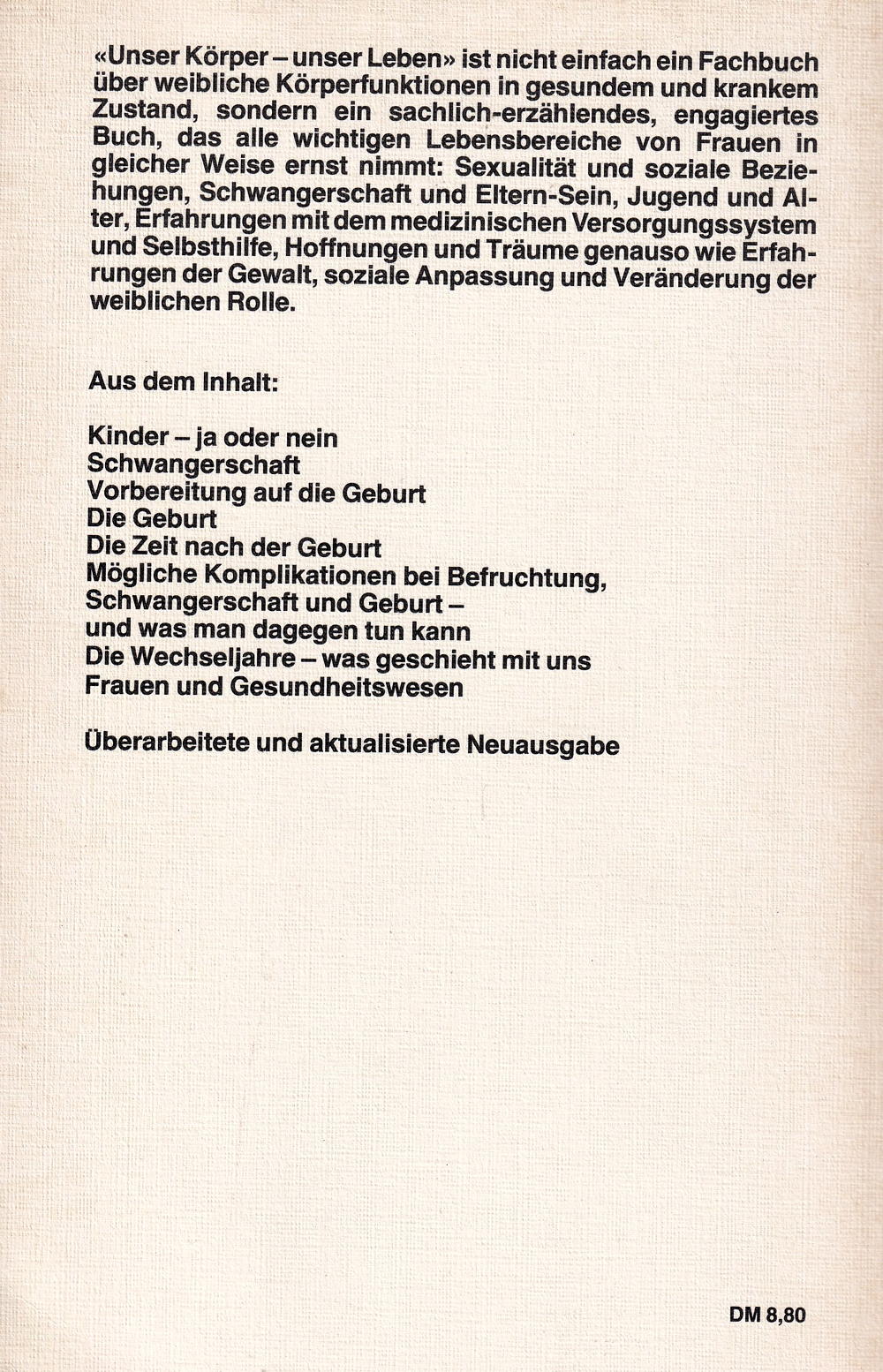 «Unser Körper-unser Leben» ist nicht einfach ein Fachbuch über weibliche Körperfunktionen in gesundem und krankem Zustand, sondern ein sachlich-erzählendes, engagiertes Buch, das alle wichtigen Lebensbereiche von Frauen in gleicher Weise ernst nimmt: Sexualität und soziale Beziehungen, Schwangerschaft und Eltern-Sein, Jugend und AIter, Erfahrungen mit dem medizinischen Versorgungssystem und Selbsthilfe, Hoffnungen und Träume genauso wie Erfahrungen der Gewalt, soziale Anpassung und Veränderung der weiblichen Rolle.