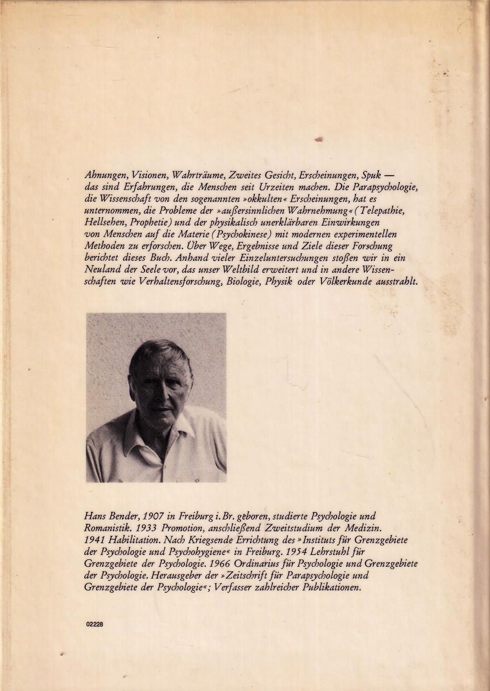 Ahnungen, Visionen, Wahrträume, Zweites Gesicht, Erscheinungen, Spukdas sind Erfahrungen, die Menschen seit Urzeiten machen. Die Parapsychologie, die Wissenschaft von den sogenannten »okkulten « Erscheinungen, hat es unternommen, die Probleme der »aussersinnlichen Wahrnehmung « (Telepathie, Hellsehen, Prophetie) und der physikalisch unerklärbaren Einwirkungen von Menschen auf die Materie (Psychokinese) mit modernen experimentellen Methoden zu erforschen. Über Wege, Ergebnisse und Ziele dieser Forschung berichtet dieses Buch. Anhand vieler Einzeluntersuchungen stossen wir in ein Neuland der Seele vor, das unser Weltbild erweitert und in andere Wissenschaften wie Verhaltensforschung, Biologie, Physik oder Völkerkunde ausstrahlt.