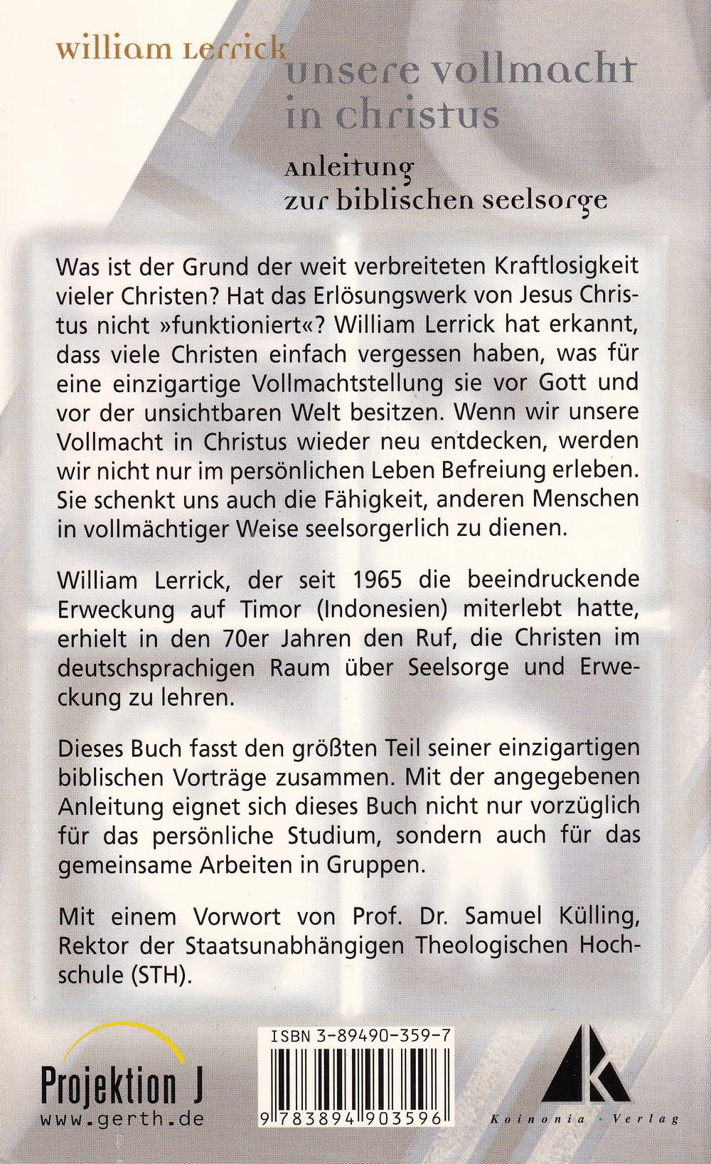 Was ist der Grund der weit verbreiteten Kraftlosigkeit vieler Christen? Hat das Erlösungswerk von Jesus Christus nicht »funktioniert«? William Lerrick hat erkannt, dass viele Christen einfach vergessen haben, was für eine einzigartige Vollmachtstellung sie vor Gott und vor der unsichtbaren Welt besitzen. Wenn wir unsere Vollmacht in Christus wieder neu entdecken, werden wir nicht nur im persönlichen Leben Befreiung erleben. Sie schenkt uns auch die Fähigkeit, anderen Menschen in vollmächtiger Weise seelsorgerlich zu dienen.