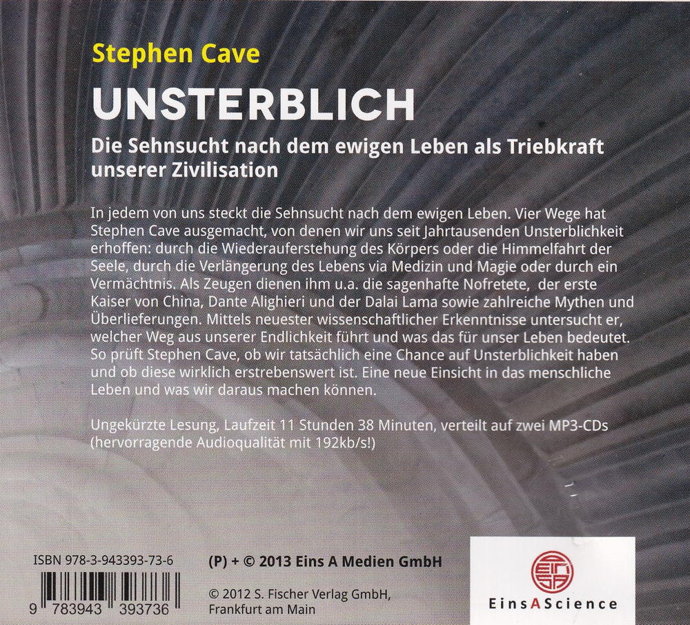In jedem von uns steckt die Sehnsucht nach dem ewigen Leben. Vier Wege hat Stephen Cave ausgemacht, von denen wir uns seit Jahrtausenden Unsterblichkeit erhoffen: durch die Wiederauferstehung des Körpers oder die Himmelfahrt der Seele, durch die Verlängerung des Lebens via Medizin und Magie oder durch ein Vermächtnis. Als Zeugen dienen ihm u. A. Die sagenhafte Nofretete, der erste Kaiser von China, Dante Alighieri und der Dalai Lama sowie zahlreiche Mythen und Überlieferungen. Mittels neuester wissenschaftlicher Erkenntnisse untersucht er, welcher Weg aus unserer Endlichkeit führt und was das für unser Leben bedeutet. So prüft Stephen Cave, ob wir tatsächlich eine Chance auf Unsterblichkeit haben und ob diese wirklich erstrebenswert ist. Eine neue Einsicht in das menschliche Leben und was wir daraus machen können.