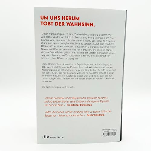Ich habe die Nähe des Dunklen gesucht. ›Unter Wahnsinnigen‹ ist eine Zustandsbeschreibung unserer Zeit. Wie gerne würden wir leicht in Freund und Feind trennen, liken oder bashen. Aber so einfach ist der Mensch nicht. Schroeder folgt seinem Drang und seiner Neugier, das Böse zu verstehen. Auf dem Pfad des Bösen trifft er einen Holocaust-Leugner im Gefängnis, begegnet einem Sexualstraftäter auf seinem Weg nach draussen, erlebt einen Mann, der ein Doppelleben geführt hat, ist mit der Letzten Generation unterwegs und besucht NATO-Soldaten in Litauen, die sich darauf vorbereiten, dem Bösen zu begegnen. Seine Recherchen führen ihn zu Psychologen und Kriminologen, zu den Tätern und Opfern, zu Philosophen und Aktivisten – und immer wieder zu sich selbst und seiner eigenen Geschichte. Er trifft einen Teil von jener Kraft, die nur das Gute will und so das Böse schafft. Florian Schroeder besucht die Abgründe dieser Welt und zeigt, dass sie nur unser Spiegel sind, in dem wir uns selbst erkennen können – wenn wir es wollen. Die Wahnsinnigen sind wir alle.