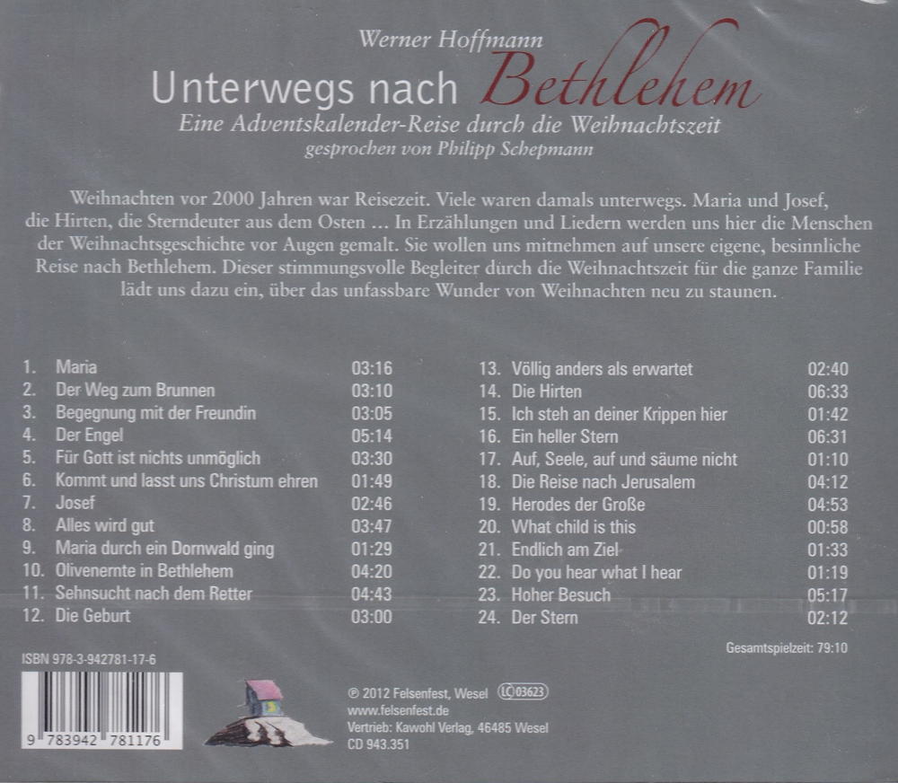 Weihnachten vor 2000 Jahren war Reisezeit. Viele waren damals unterwegs. Maria und Josef, die Hirten, die Sterndeuter aus dem Osten... In Erzählungen und Liedern werden uns hier die Menschen der Weihnachtsgeschichte vor Augen gemalt. Sie wollen uns mitnehmen auf unsere eigene, besinnliche Reise nach Bethlehem. Dieser stimmungsvolle Begleiter durch die Weihnachtszeit für die ganze Familie lädt uns dazu ein, über das unfassbare Wunder von Weihnachten neu zu staunen.