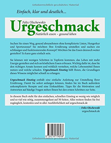 Suchen Sie einen Weg, gesund abzunehmen ohne komplizierte Listen, Hungerkur und Sportexzesse? Sie möchten Ihre Ernährung umstellen und suchen ein schlüssiges und funktionierendes Konzept? Möchten Sie das Essen dennoch weiter geniessen? Es kann ganz einfach sein. Sie können mit wenigen Schritten in Topform kommen, das Leben mit mehr Energie geniessen und sich an köstlichem Essen erfreuen. Wichtig dafür ist, dass Sie den richtigen Ansatz kennen und wirklich verstehen, welche Lebensmittel Ihnen nutzen und welche schaden. Urgeschmack Einstieg hilft Ihnen, die Grundlagen dieses Wissens möglichst schnell zu erlangen. Urgeschmack Einstieg enthält eine einfache Anleitung zur Umstellung Ihrer Ernährung. Damit Sie sofort anfangen können, finden Sie im Buch ausserdem unkomplizierte Rezepte und eine Einkaufsliste. Tipps für die Motivation und Antworten auf häufige Fragen stehen Ihnen bei den ersten Schritten zur Seite.