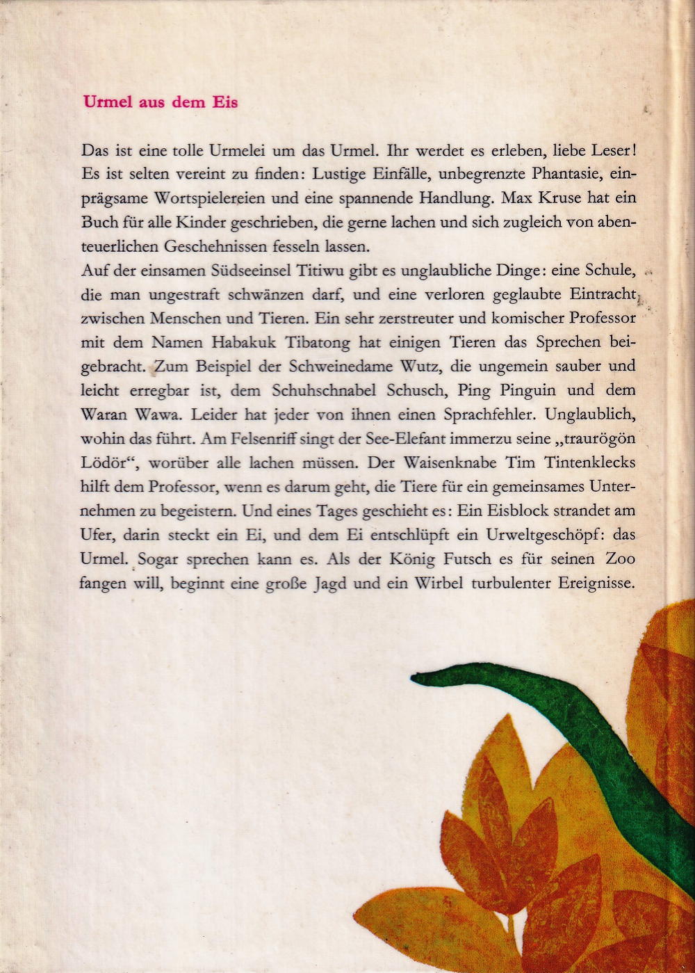 Das ist eine tolle Urmelei um das Urmel. Ihr werdet es erleben, liebe Leser! Es ist selten vereint zu finden: Lustige Einfälle, unbegrenzte Phantasie, einprägsame Wortspielereien und eine spannende Handlung. Max Kruse hat ein Buch für alle Kinder geschrieben, die gerne lachen und sich zugleich von abenteuerlichen Geschehnissen fesseln lassen. Auf der einsamen Südseeinsel Titiwu gibt es unglaubliche Dinge: eine Schule, die man ungestraft schwänzen darf, und eine verloren geglaubte Eintracht; zwischen Menschen und Tieren. Ein sehr zerstreuter und komischer Professor mit dem Namen Habakuk Tibatong hat einigen Tieren das Sprechen bei gebracht. Zum Beispiel der Schweinedame Wutz, die ungemein sauber und leicht erregbar ist, dem Schuhschnabel Schusch, Ping Pinguin und dem Waran Wawa. Leider hat jeder von ihnen einen Sprachfehler. Unglaublich, wohin das führt. Am Felsenriff singt der See-Elefant immerzu seine „traurögön Lödör“,worüber alle lachen müssen. Der Waisenknabe Tim Tintenklecks hilft dem Professor, wenn es darum geht, die Tiere für ein gemeinsames Unternehmen zu begeistern. Und eines Tages geschieht es: Ein Eisblock strandet am Ufer, darin steckt ein Ei, und dem Ei entschlüpft ein Urweltgeschöpf: das Urmel. Sogar sprechen kann es. Als der König Futsch es für seinen Zoo fangen will, beginnt eine grosse Jagd und ein Wirbel turbulenter Ereignisse.