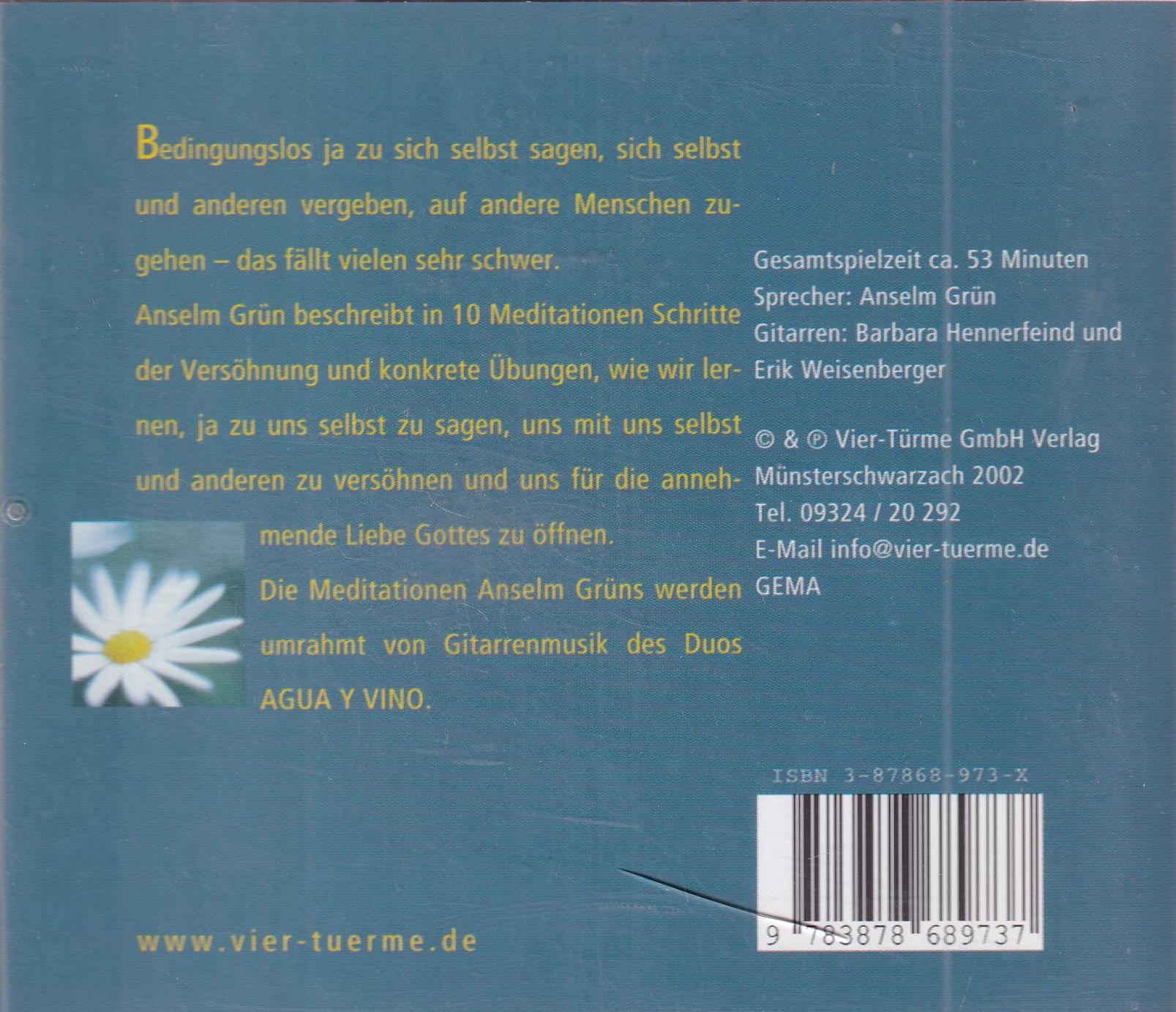 Bedingungslos ja zu sich selbst sagen, sich selbst und anderen vergeben, auf andere Menschen zugehen - das fällt vielen sehr schwer. Anselm Grün beschreibt in 10 Meditationen Schritte der Versöhnung und konkrete Übungen, wie wir lernen, ja zu uns selbst zu sagen, uns mit uns selbst und anderen zu versöhnen und uns für die annehmende Liebe Gottes zu öffnen. Die Meditationen Anselm Grüns werden umrahmt von Gitarrenmusik des Duos AGUA Y VIN0.
