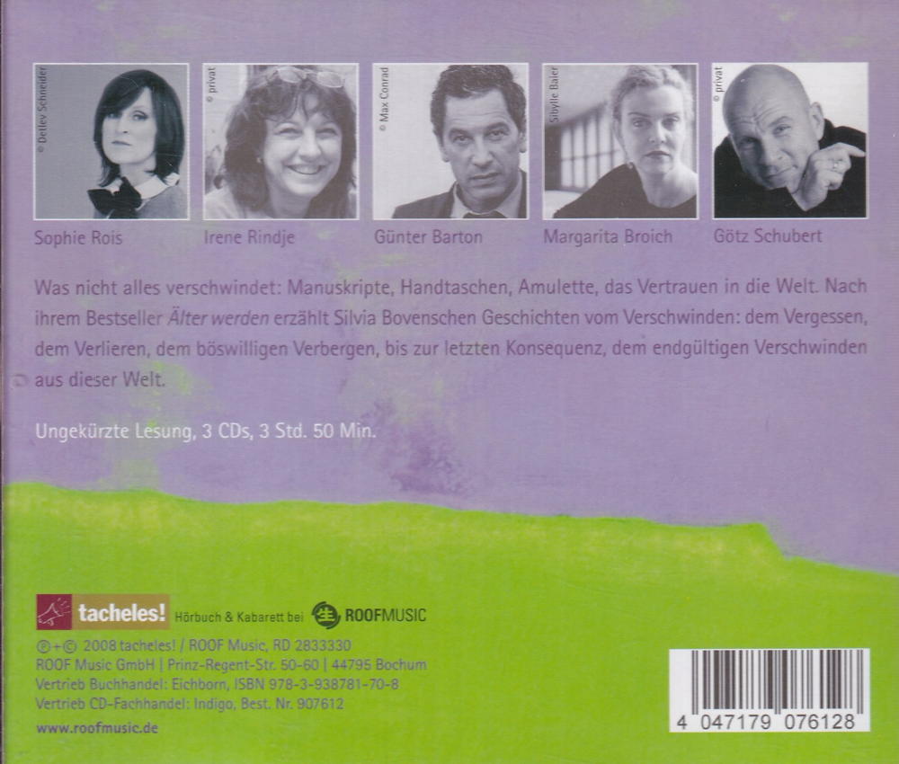 Was nicht alles verschwindet: Manuskripte, Handtaschen, Amulette, das Vertrauen in die Welt. Nach ihrem Bestseller Älter werden erzählt Silvia Bovenschen Geschichten vom Verschwinden: dem Vergessen, dem Verlieren, dem böswilligen Verbergen, bis zur letzten Konsequenz, dem endgültigen Verschwinden aus dieser Welt.