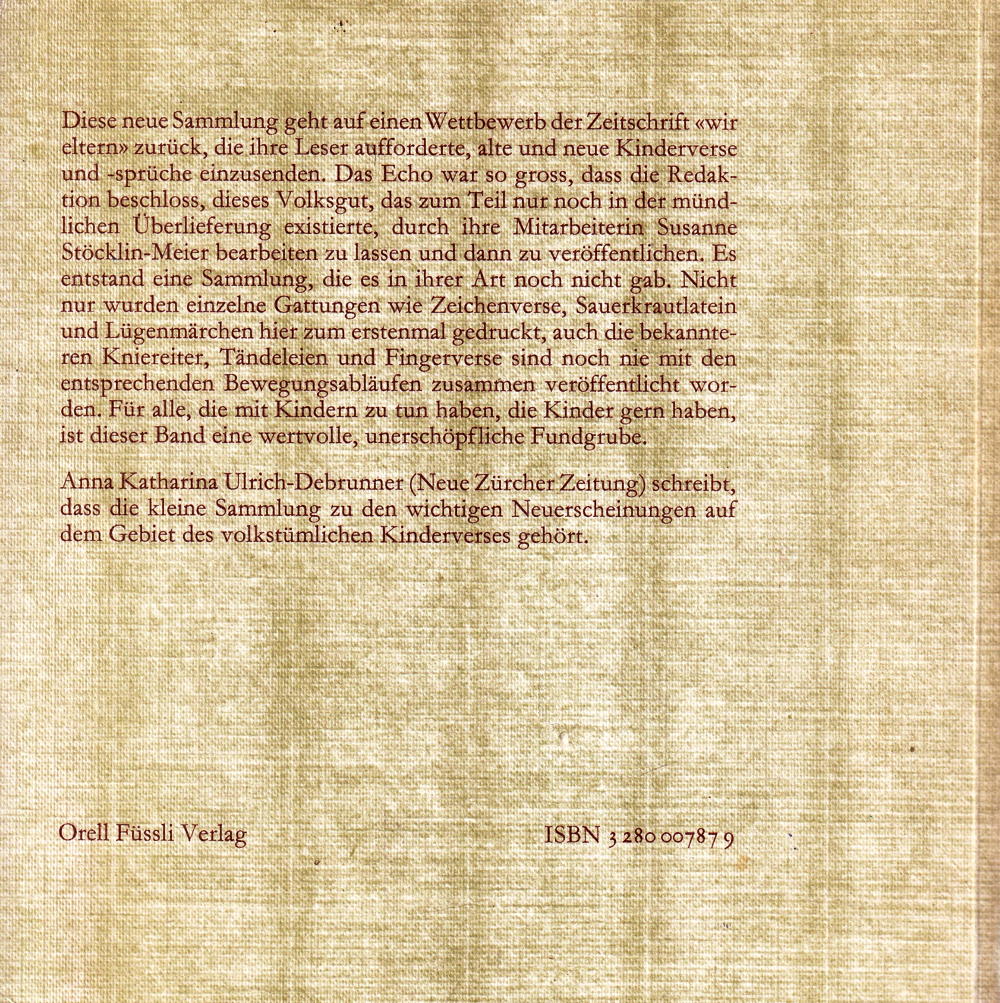 Diese neue Sammlung geht auf einen Wettbewerb der Zeitschrift «wir eltern» zurück, die ihre Leser aufforderte, alte und neue Kinderverse und -sprüche einzusenden. Das Echo war so gross, dass die Redaktion beschloss, dieses Volksgut, das zum Teil nur noch in der mündlichen Überlieferung existierte, durch ihre Mitarbeiterin Susanne Stöcklin-Meier bearbeiten zu lassen und dann zu veröffentlichen. Es entstand eine Sammlung, die es in ihrer Art noch nicht gab. Nicht nur wurden einzelne Gattungen wie Zeichenverse, Sauerkrautlatein und Lügenmärchen hier zum erstenmal gedruckt, auch die bekannteren Kniereiter, Tändeleien und Fingerverse sind noch nie mit den entsprechenden Bewegungsabläufen zusammen veröffentlicht worden. Für alle, die mit Kindern zu tun haben, die Kinder gern haben, ist dieser Band eine wertvolle, unerschöpfliche Fundgrube.