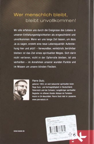 Vielen spirituellen und therapeutischen Ratschlägen liegt ein letztendlich überforderndes Perfektionsideal zugrunde: noch ganzheitlicher, noch erleuchteter, noch versöhnter...sollen wir werden. Pierre Stutz sieht das anders: Wer menschlich bleibt, bleibt unvollkommen, macht Fehler, kennt Zerrissenheit und Verwundungen. Das ehrliche und persönliche Buch wendet sich an Suchende gerade in Umbruchs- und Krisenzeiten. Es befreit, zu sich selbst mit allen Macken und Kanten zu stehen. Es ermutigt mit vielen konkreten Impulsen authentisch zu bleiben – gerade angesichts dunkler und schwieriger Erfahrungen. Diese neue Spiritualität der Unvollkommenheit erschliesst das Buch über grosse Gestalten der Mystik aus Vergangenheit und Gegenwart. Persönlich gehaltene Meditationstexte des Autors inspirieren Leserinnen und Leser, ihre eigenen Lebenserfahrungen auszusprechen. Die Reise zur eigenen Unvollkommenheit stösst auf ungeahnte Wunder der Geborgenheit und des wahren inneren Friedens. Von Publik-Forum zum Buch des Monats Februar 2003 gewählt.